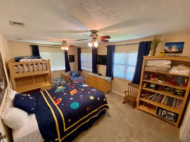 Beds: bunk bed (2 twins); queen (1), children's princess bed (1)